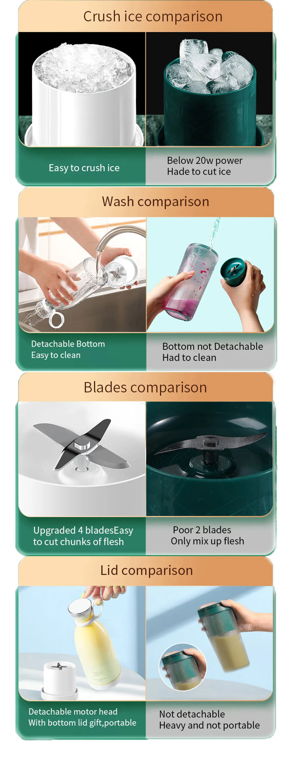 Note: The actual delivery is 4 blades, and the bottom cover is flat and non-striped, as shown in the following actual picture. Due to the different monitor and light effect, the actual color of the item might be slightly different from the color showed on the pictures. Thank you! Please allow 1-2cm measuring deviation due to manual measurement. ![]() 1 X Portable Blender Bottle
